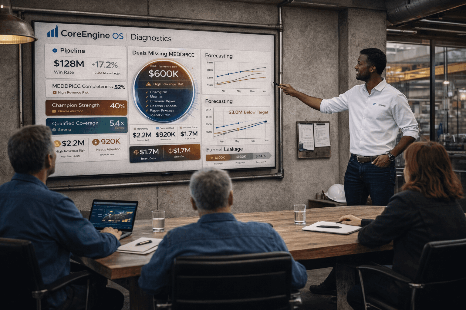 CoreEngine OS is a structured Revenue Operating System that connects pipeline generation, deal execution, and financial outcomes, giving leadership full visibility and control over revenue, margin, and cash flow.